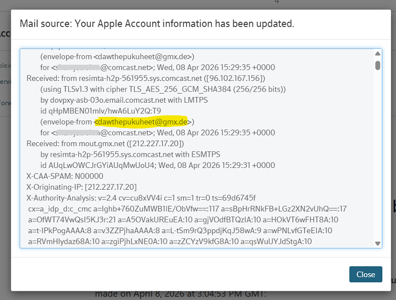 I can understand why many would be fooled or worried over this email. The sender address appears to be legitimate… but it has been spoofed and faked. The real email sender has been obfuscated, but the email source code suggests it was sent through some German server: