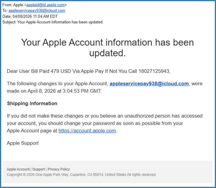 Apple Account Update phishing emails are everywhere today! If you receive the email (shown below), please know that it is a phishing attempt and a fake. There has been no update; there were no charges to your card. Do not call the phone number in the message, and just delete the email!